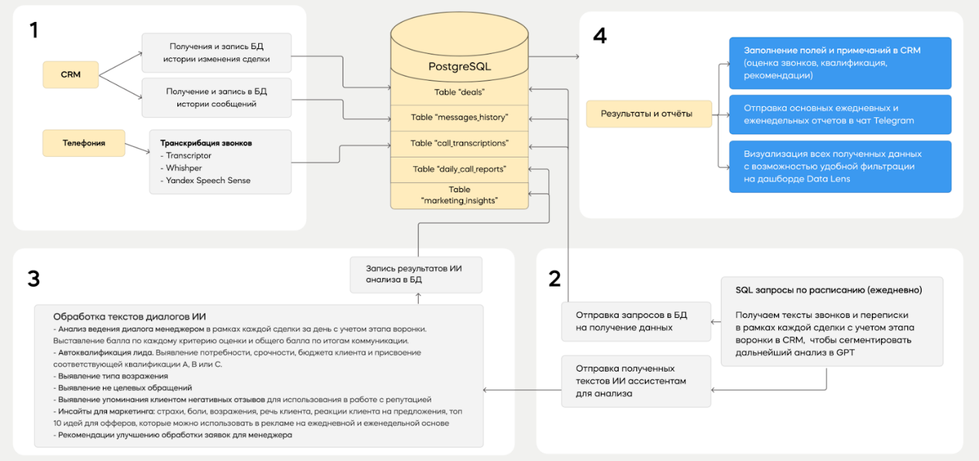 - Текст поступает в Google-таблицу, сервис оценивает разговор, ищет ошибки, добавляет рекомендации по улучшению.