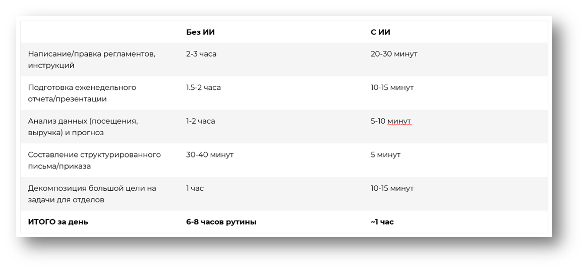 Отдельная категория задач — подготовка презентаций. Мы как руководители часто делаем презентации для партнеров, для инвесторов, для внутренних совещаний. И это тоже отнимает массу времени.