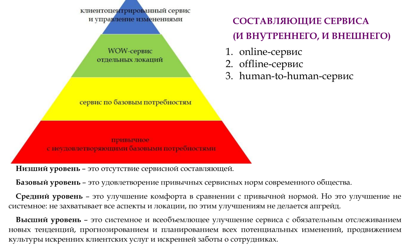 Второй сценарий: человек увидел рекламу и сразу пришёл в клинику. Здесь мы сталкиваемся с офлайн-сервисом клиники. Представлю схему уровней сервиса, аналогичную схеме коммуникативного маркетинга.